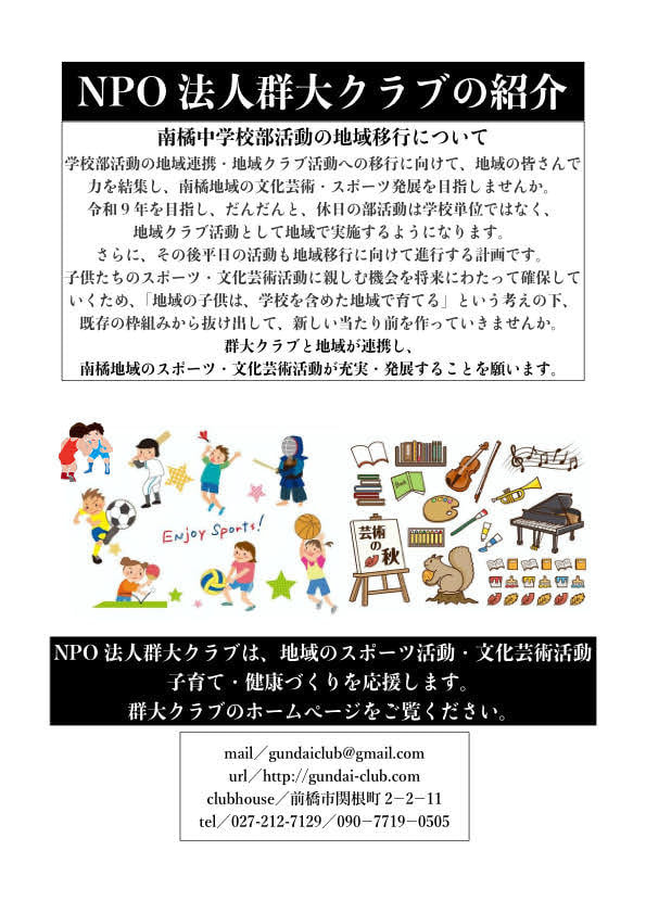 topページへ 令和8年度放課後児童クラブ入所案内 パレイストラ関根・パレイストラ南橘・パレイストラ荒牧 小学校の新入生就学前健診時にそれぞれの小学校で配布していただきます。 入所をご希望されるご家庭は、それぞれのクラブハウスをお尋ねください。